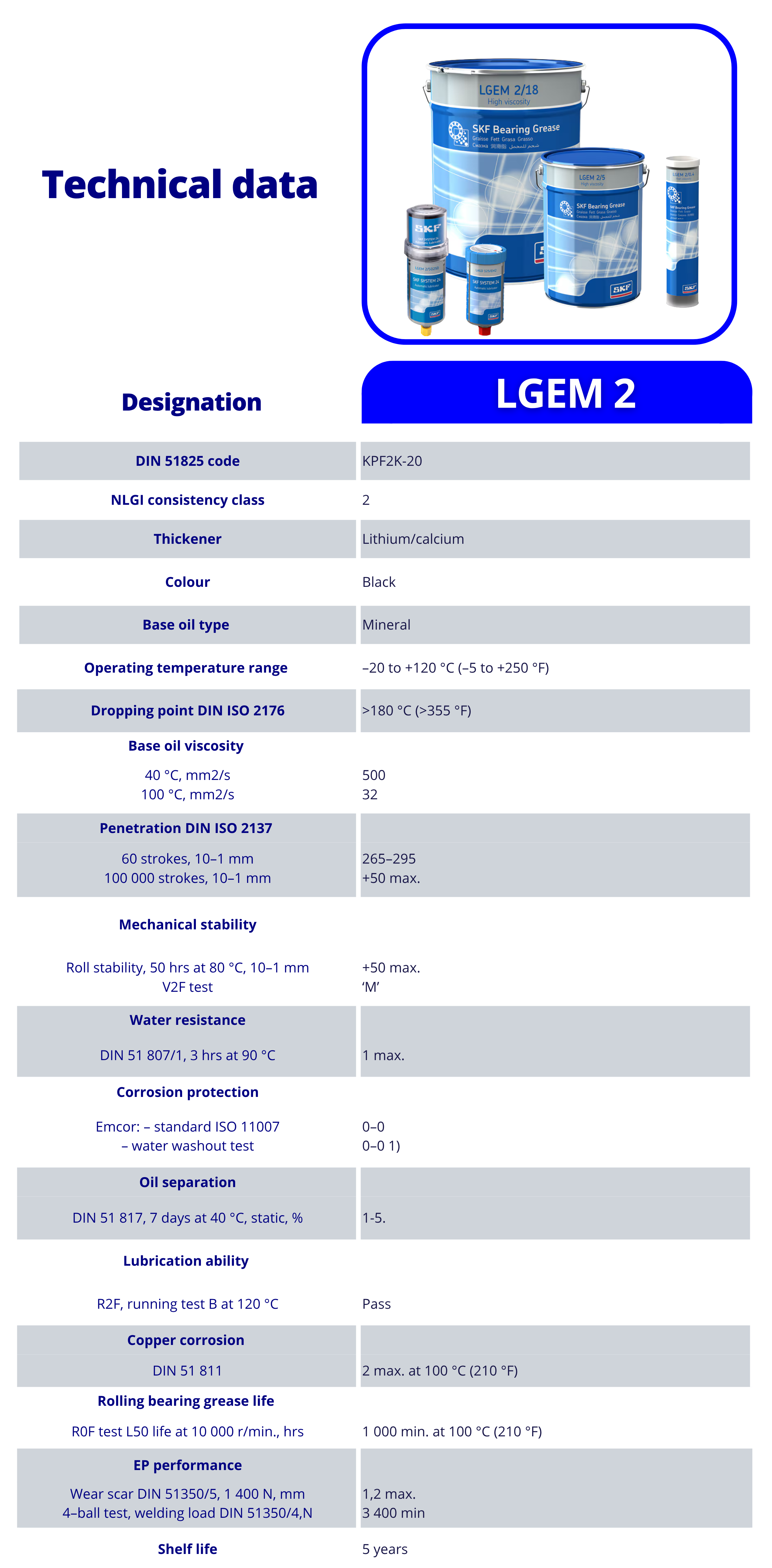 SKF LGEM 2 เป็น จาระบีความหนืดสูง ผลิตจากน้ำมันแร่ ใช้ สบู่ลิเธียม/แคลเซียม มีส่วนผสมของ โมลิบดีนัมไดซัลไฟด์และกราไฟต์ ช่วยปกป้องเป็นพิเศษสำหรับการใช้งานหนักที่ต้อง รับภาระสูง, แรงสั่นสะเทือนสูง, และ การหมุนช้า