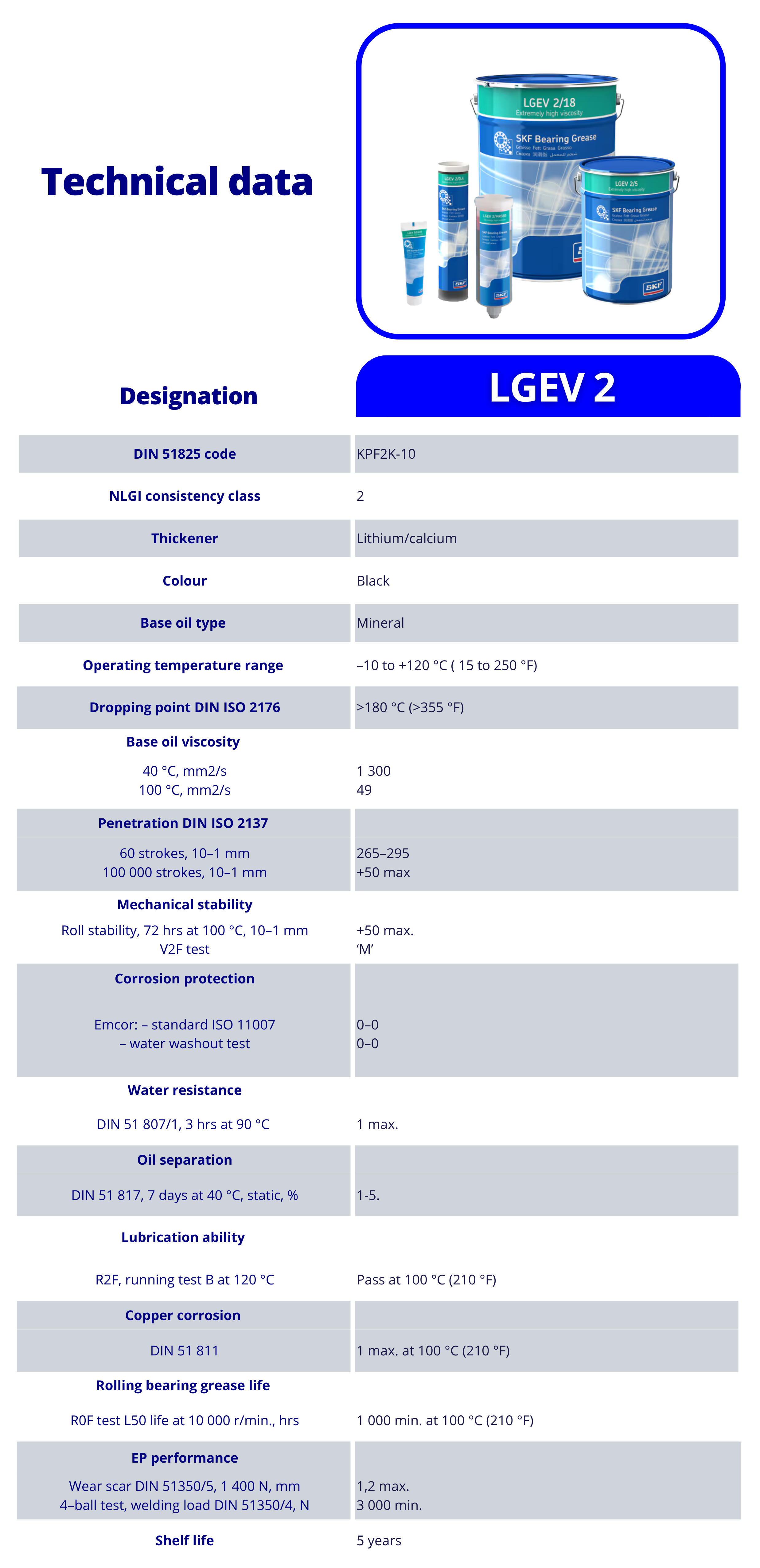 SKF LGEV 2 เป็น จาระบีความหนืดสูงมาก ผลิตจากน้ำมันแร่ ใช้ สบู่ลิเธียม-แคลเซียม พร้อม โมลิบดีนัมไดซัลไฟด์และกราไฟต์ในปริมาณสูง น้ำมันมีความหนืดสูงมาก มอบการปกป้องที่ยอดเยี่ยมสำหรับ สภาวะการทำงานหนักที่สุด ได้แก่ ภาระหนัก, การหมุนช้า, และ แรงสั่นสะเทือนรุนแรง