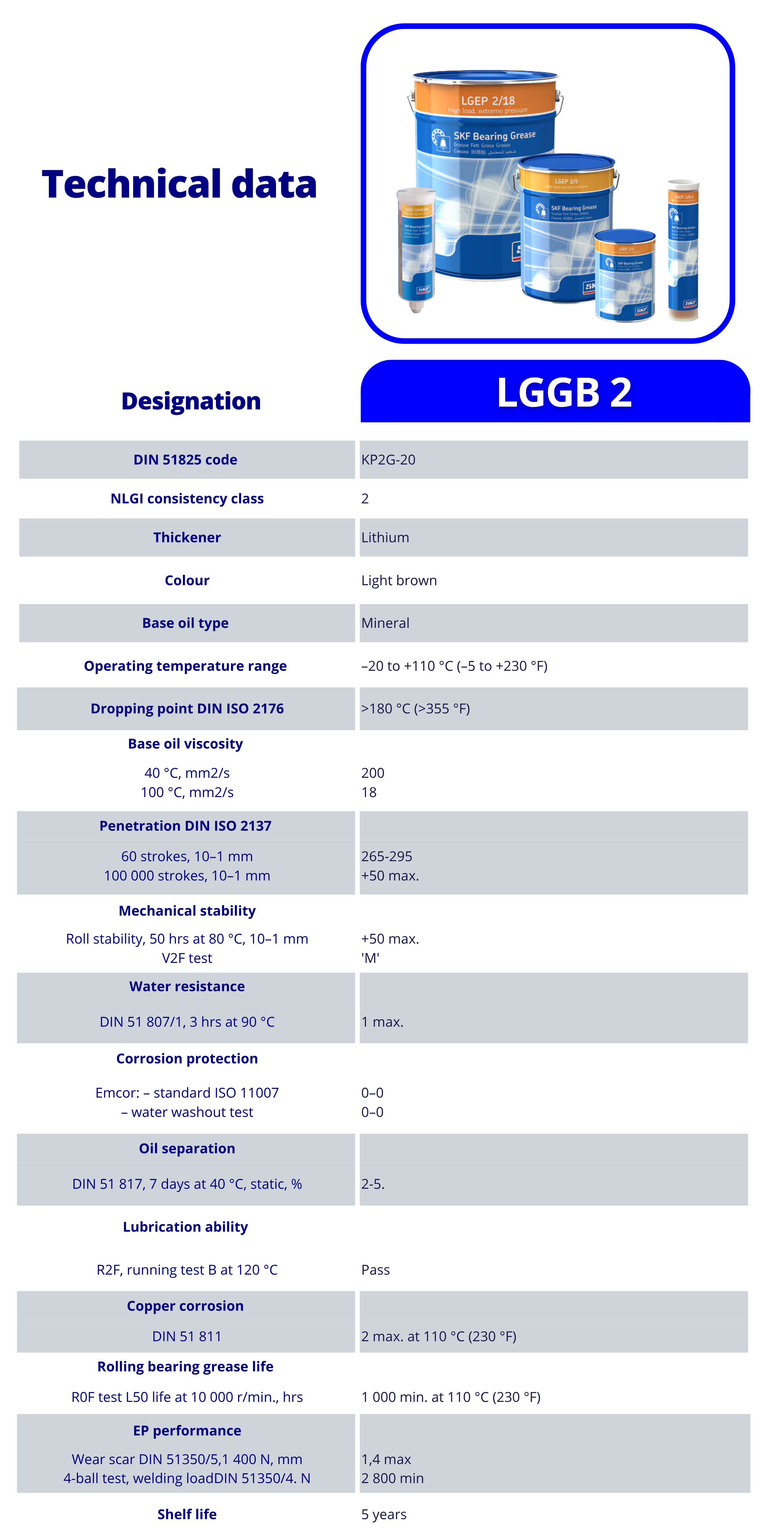 SKF LGEP 2 เป็นจารบีชนิดเข้มข้น ผลิตจาก น้ำมันแร่ + สบู่ลิเธียม พร้อมสารเติมแต่ง รับแรงกดสูง (EP) เหมาะสำหรับงานที่ต้องทนแรงกดดันสูง การสั่นสะเทือน และสภาวะการทำงานที่รุนแรง