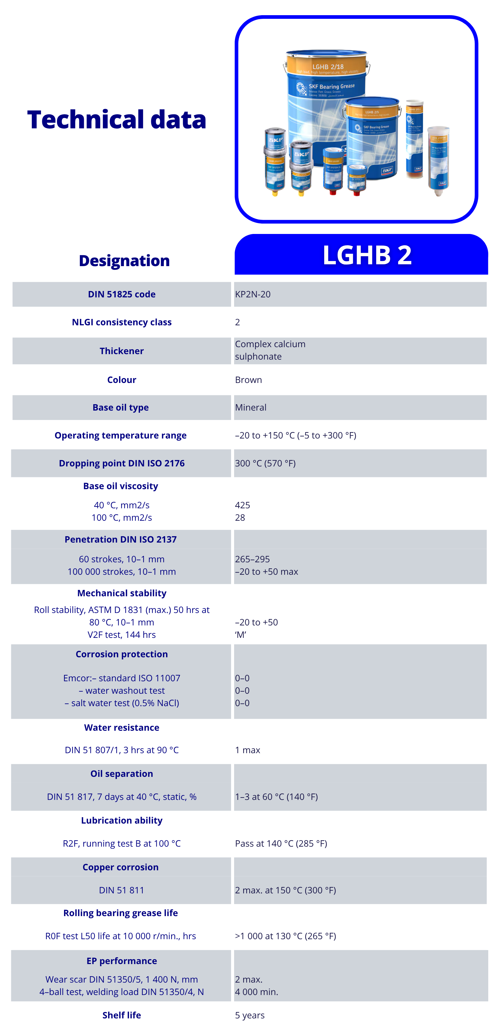 SKF LGHB 2 เป็น จารบีความหนืดสูง ผลิตจากน้ำมันแร่ ใช้ สารเพิ่มความข้นเชิงซ้อนแคลเซียมซัลโฟเนต และมี โมลิบดีนัมไดซัลไฟด์และกราไฟต์ มอบการปกป้องที่ยอดเยี่ยมสำหรับ สภาวะการทำงานหนัก เช่น ภาระหนัก, การหมุนช้า, และ อุณหภูมิสูง เหมาะสำหรับอุตสาหกรรมปูนซีเมนต์ เหมืองแร่ และอุตสาหกรรมโลหะ