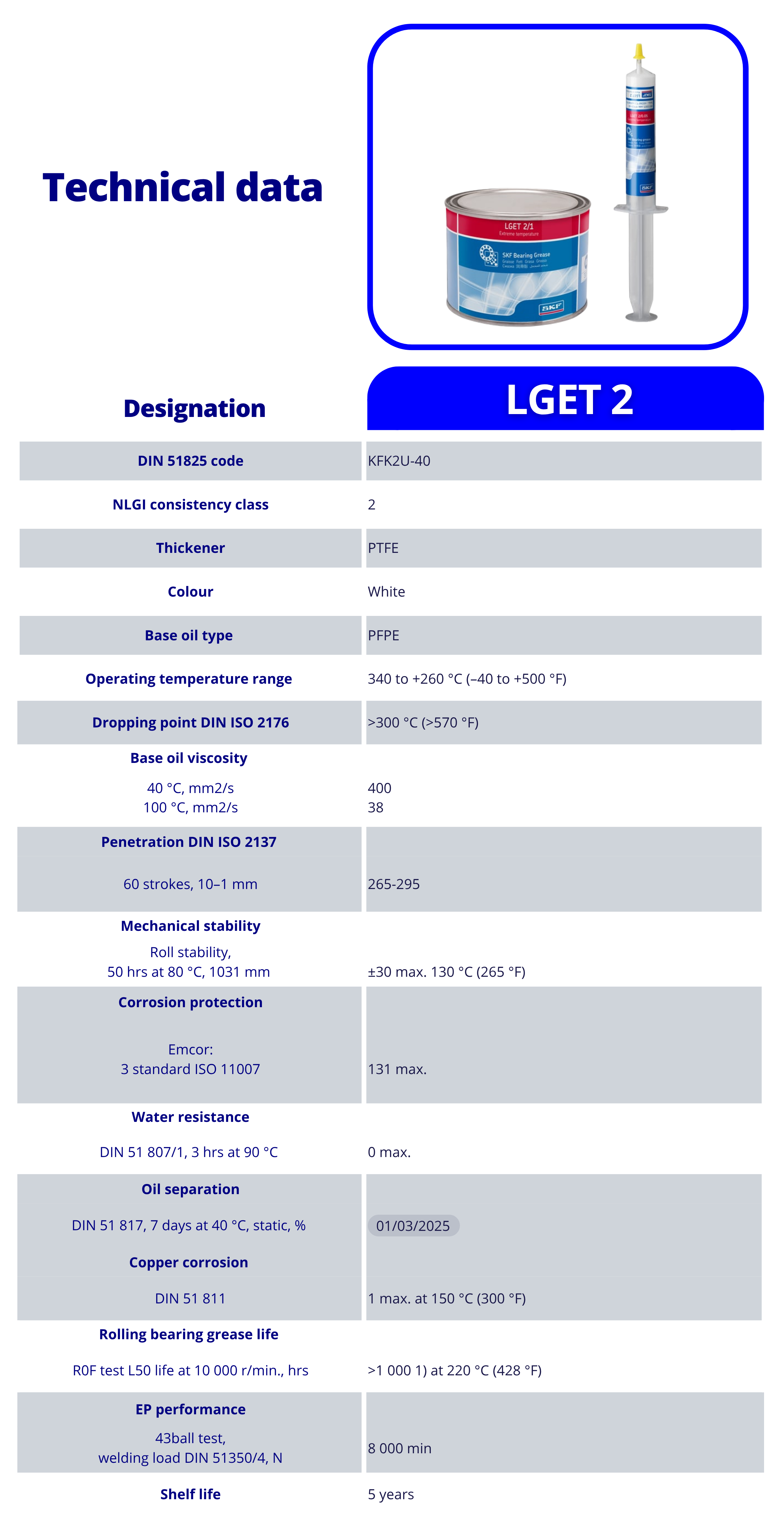 SKF LGET 2 เป็นจาระบีสังเคราะห์จากน้ำมันฟลูออรีน ใช้สารเพิ่มความข้น PTFE เหมาะสำหรับงานที่ต้องเผชิญอุณหภูมิสูงมาก ตั้งแต่ 200 °C (390 °F) ถึง 260 °C (500 °F) พร้อมทั้งทนต่อสภาพการทำงานที่รุนแรงและสารเคมีได้ดีเยี่ยม