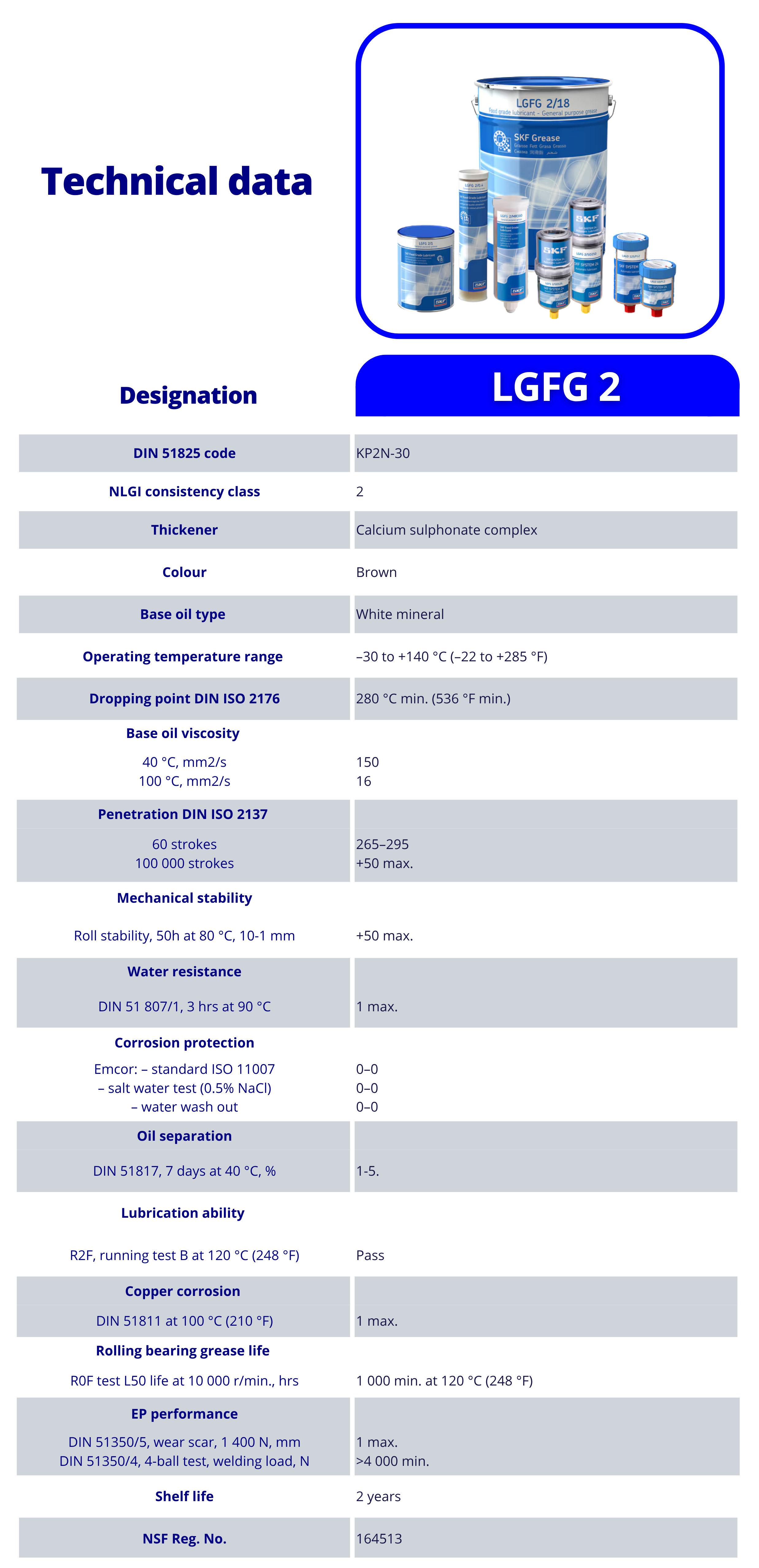 SKF LGFG 2 เป็นจาระบีเกรดอาหารคุณภาพสูง ใช้เทคโนโลยี สารเพิ่มความข้นแคลเซียมซัลโฟเนตคอมเพล็กซ์ และ น้ำมันแร่สีขาว ออกแบบมาเพื่อรองรับ น้ำหนักมาก สภาพแวดล้อมเปียกชื้น และอุณหภูมิผันผวน เหมาะสำหรับอุตสาหกรรมอาหารและเครื่องดื่ม