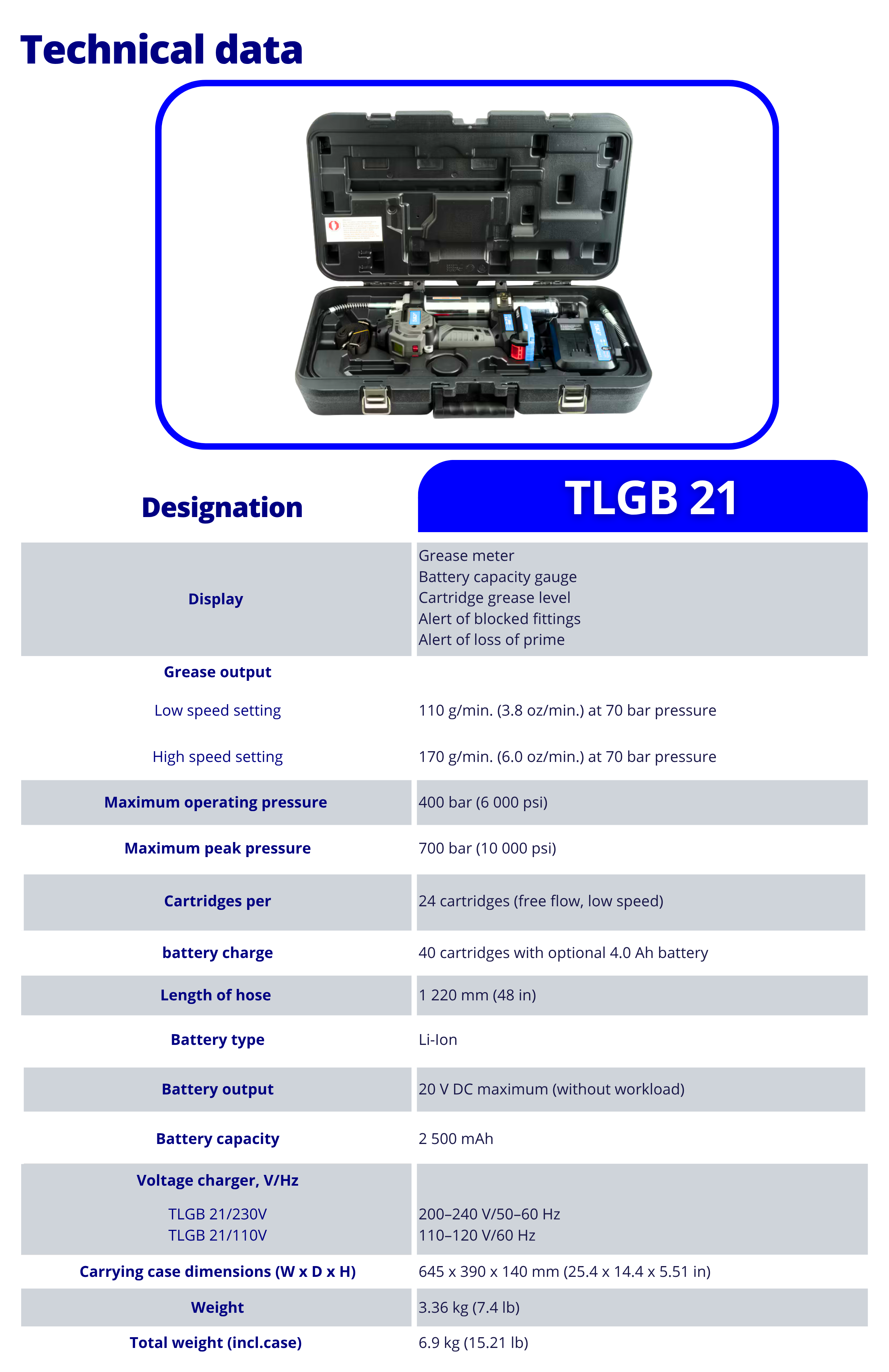 TLGB 21 คือปืนอัดจาระบีแบตเตอรี่รุ่นใหม่ล่าสุดที่ถูกออกแบบมาเพื่อ ยกระดับประสิทธิภาพการหล่อลื่นให้สูงสุด สำหรับงานอุตสาหกรรมและงานหนักทุกประเภท ด้วยการผสมผสานระหว่าง เทคโนโลยีล้ำสมัยและโครงสร้างตัวเครื่องที่แข็งแรงทนทาน TLGB 21 สามารถทำงานได้อย่างต่อเนื่องและแม่นยำ ลดความเสี่ยงจากการหล่อลื่นที่มากหรือน้อยเกินไป ตัวเครื่องมาพร้อม มาตรวัดจาระบีในตัว ที่ช่วยให้ตรวจสอบปริมาณจาระบีที่จ่ายได้แบบเรียลไทม์ และ หน้าจอ LCD อเนกประสงค์ แสดงปริมาณจาระบี, ระดับแบตเตอรี่, ระดับจาระบีในตลับ และแจ้งเตือนหากเกิดการอุดตันหรือสูญเสียแรงดัน