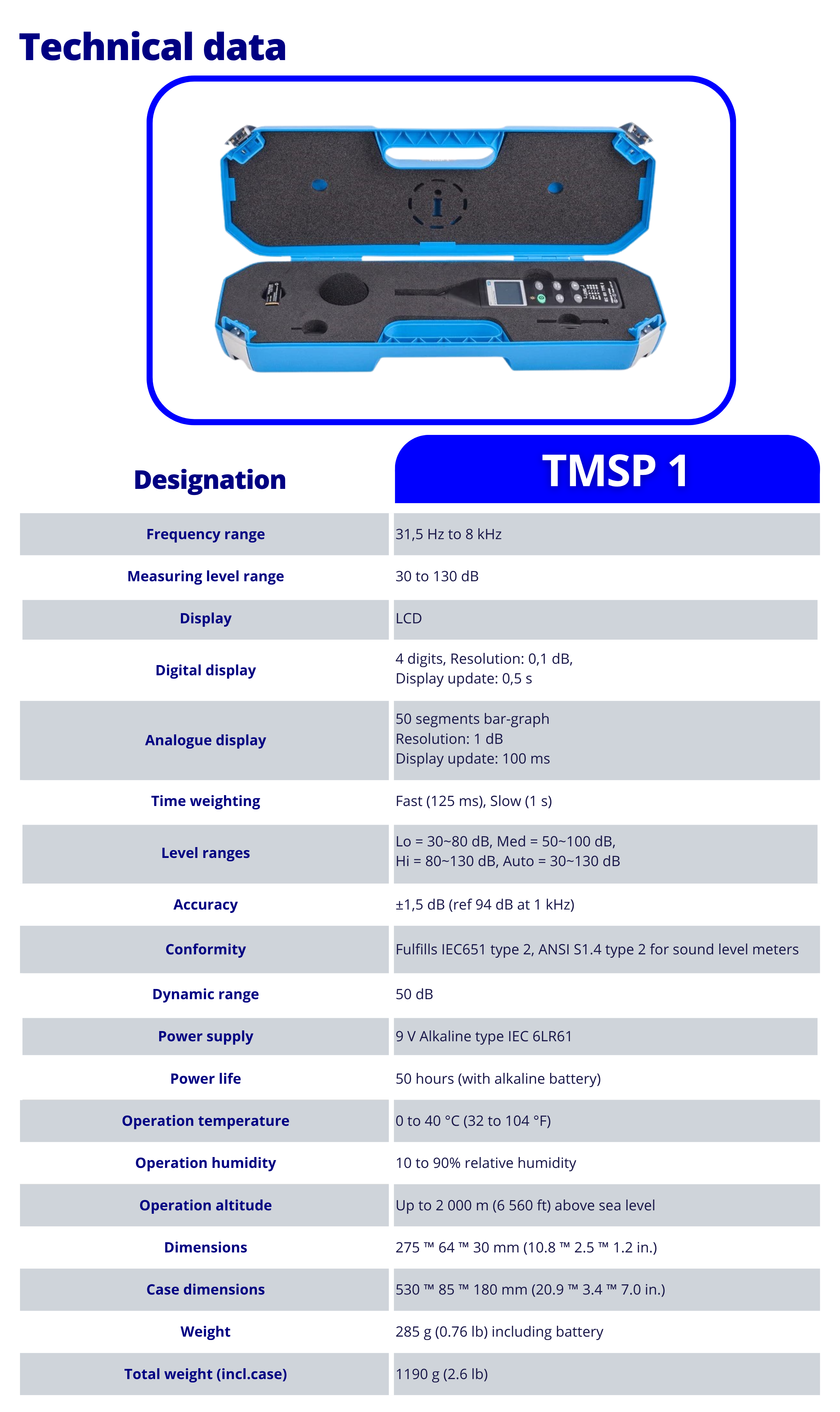 SKF TMSP 1 คือเครื่องวัดระดับความดังเสียงแบบพกพาคุณภาพสูง ใช้วัดระดับเสียงในหน่วย เดซิเบล (dB) เพื่อช่วยตรวจสอบเสียงรบกวนในสภาพแวดล้อมการทำงานหรือในกระบวนการอุตสาหกรรม สามารถใช้ได้ทั้งในเชิงปริมาณและเชิงคุณภาพ ด้วยการออกแบบที่ใช้งานง่าย พกพาสะดวก และให้ค่าการวัดที่แม่นยำ
