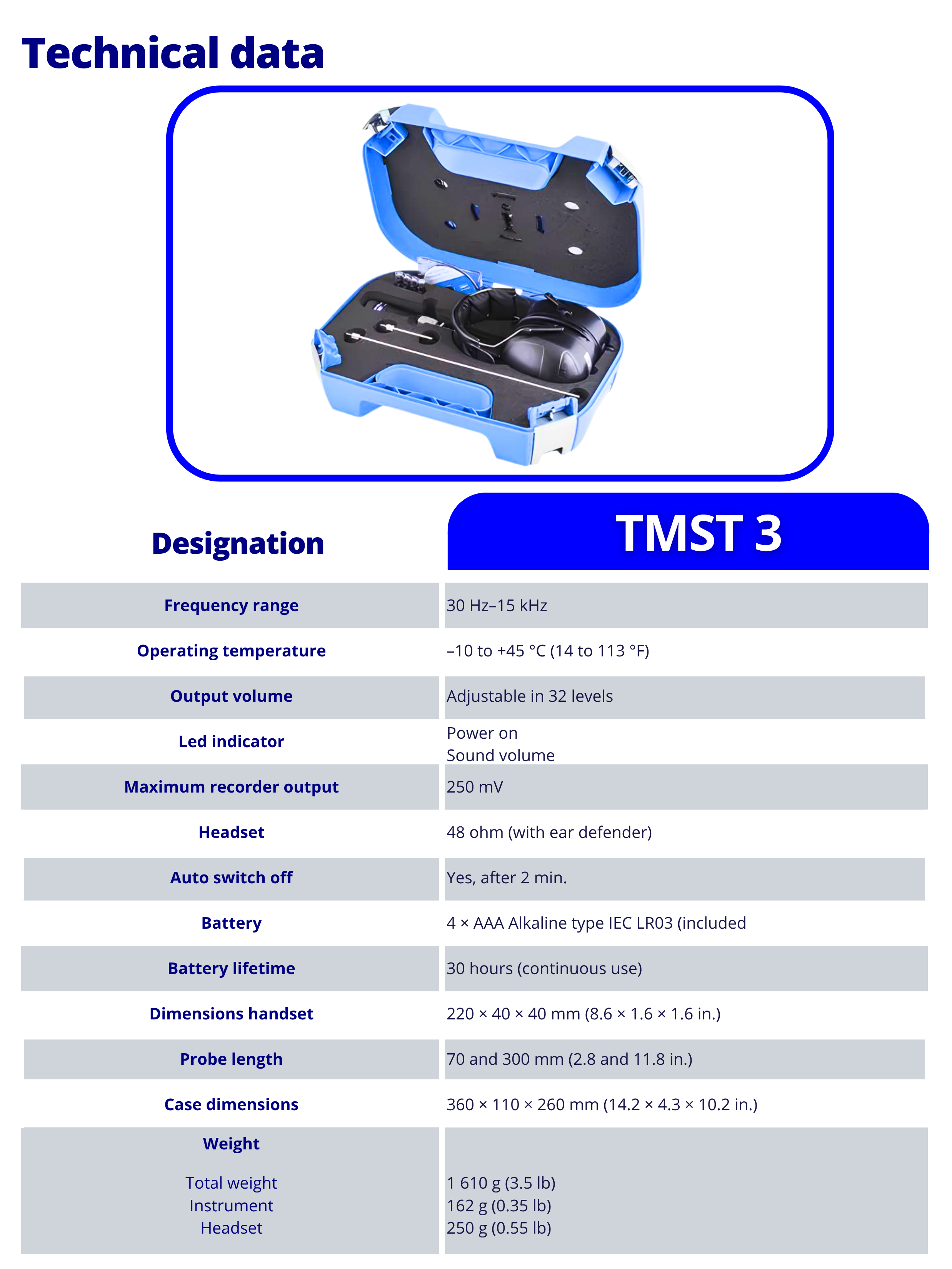 เครื่องฟังเสียงตลับลูกปืนและเครื่องจักร SKF TMST 3 เป็นอุปกรณ์ตรวจจับเสียงและความสั่นสะเทือนคุณภาพสูง ช่วยให้ผู้ใช้งานสามารถตรวจหาปัญหาในเครื่องจักรได้อย่างรวดเร็วและแม่นยำ โดยไม่จำเป็นต้องมีการฝึกอบรมเฉพาะทาง มาพร้อมชุดหูฟัง หัววัดสองขนาด ปุ่มปรับระดับเสียง และแผ่น CD ตัวอย่างเสียง บรรจุในกระเป๋าหิ้วทนทาน เหมาะสำหรับการบำรุงรักษาเชิงป้องกันในโรงงานอุตสาหกรรม