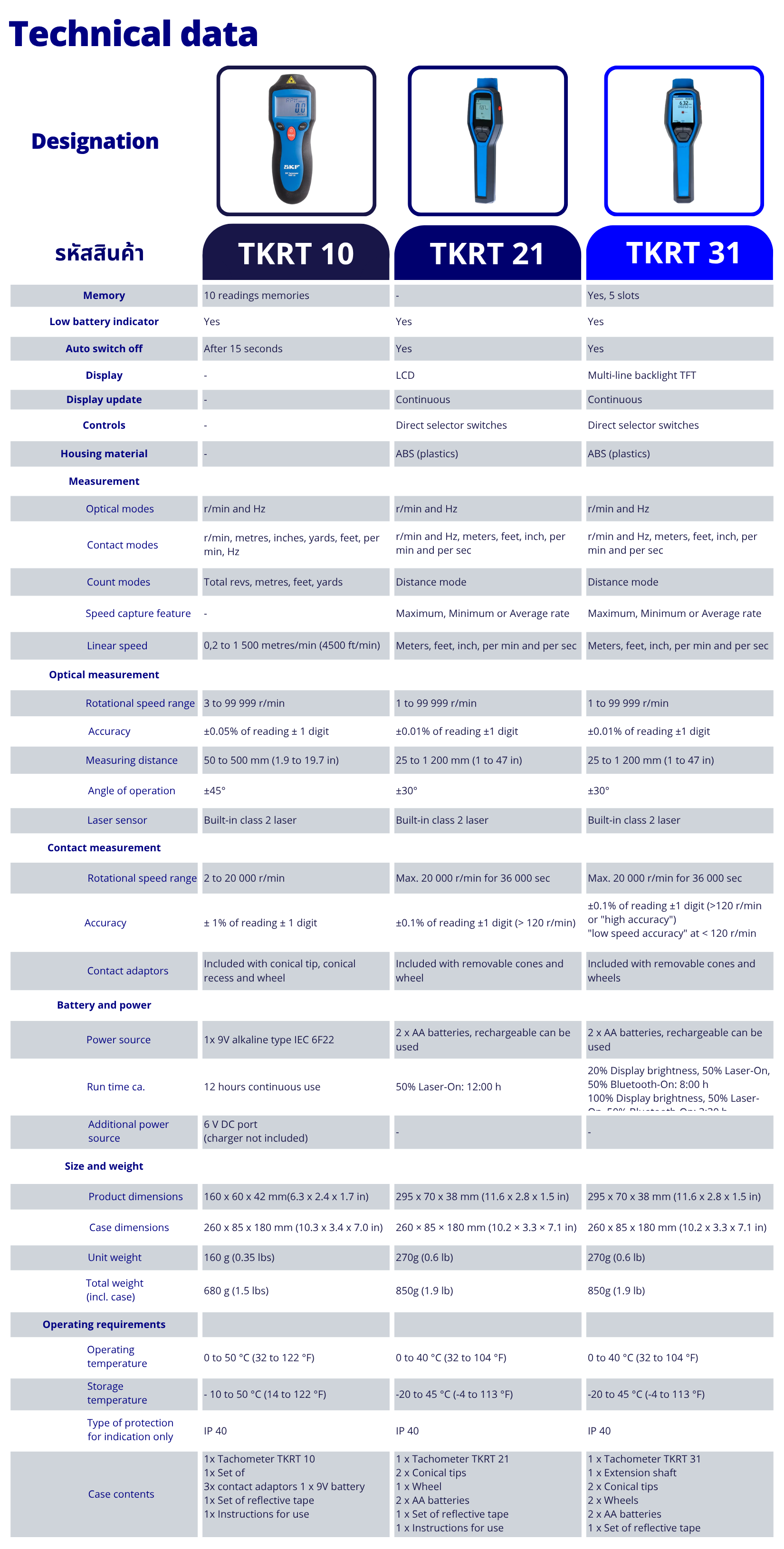 เครื่องวัดความเร็วรอบ TKRT Series ซึ่งสามารถวัดความเร็วในการหมุนและความเร็วเชิงเส้นของอุปกรณ์หมุนได้ทั้งแบบ เลเซอร์ และ สัมผัส อุปกรณ์มีขนาดกะทัดรัด พกพาสะดวก ให้ผลการวัดที่รวดเร็วและแม่นยำ โดยเซ็นเซอร์เลเซอร์ช่วยให้วัดค่าได้จากระยะปลอดภัยจากเครื่องจักรที่กำลังหมุน พร้อมอะแดปเตอร์แบบสัมผัสและแบตเตอรี่ทั้งแบบมาตรฐานหรือแบบชาร์จไฟได้ ข้อมูลผลลัพธ์จะแสดงอย่างชัดเจนบนหน้าจอขนาดใหญ่ อ่านง่ายและใช้งานสะดวก