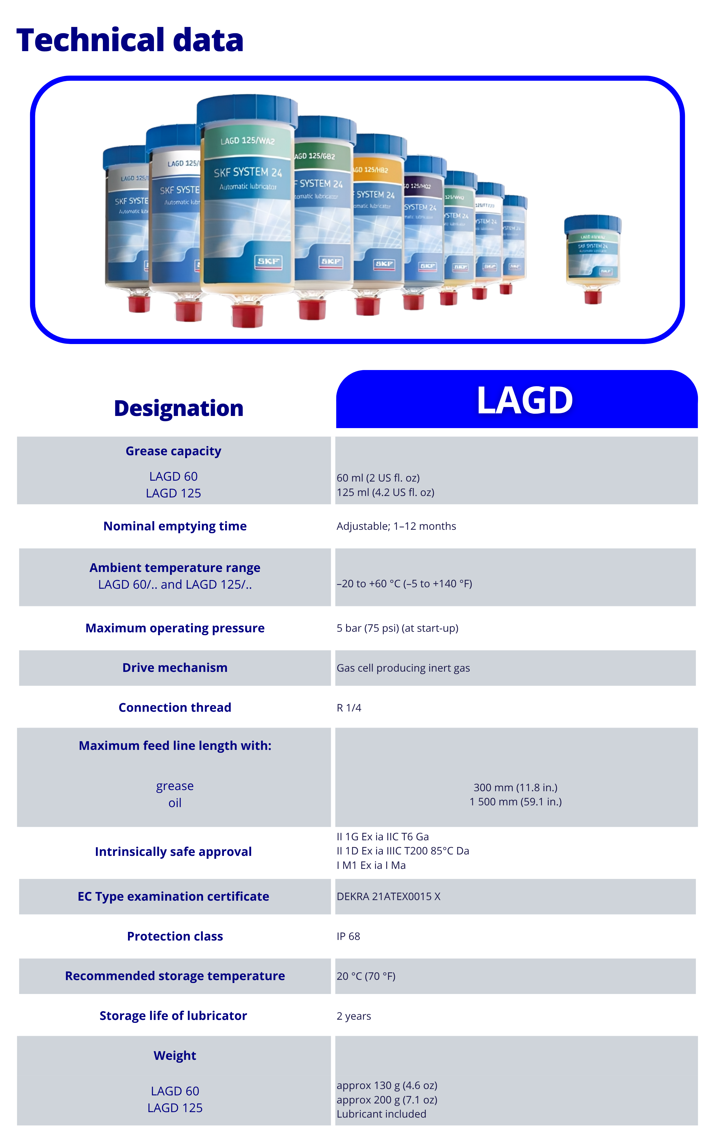 กระปุกเติมสารหล่อลื่นอัตโนมัติแบบจุดเดียว SKF LAGD เป็นระบบจ่ายสารหล่อลื่นที่ทำงานด้วยก๊าซ ออกแบบมาให้ใช้งานง่าย ไม่ต้องใช้เครื่องมือพิเศษในการตั้งค่า และสามารถหยุดการทำงานได้ทันทีเมื่อเครื่องจักรหยุด ช่วยให้การหล่อลื่นตลับลูกปืนเป็นไปอย่างแม่นยำ ปลอดภัย และลดการปนเปื้อน