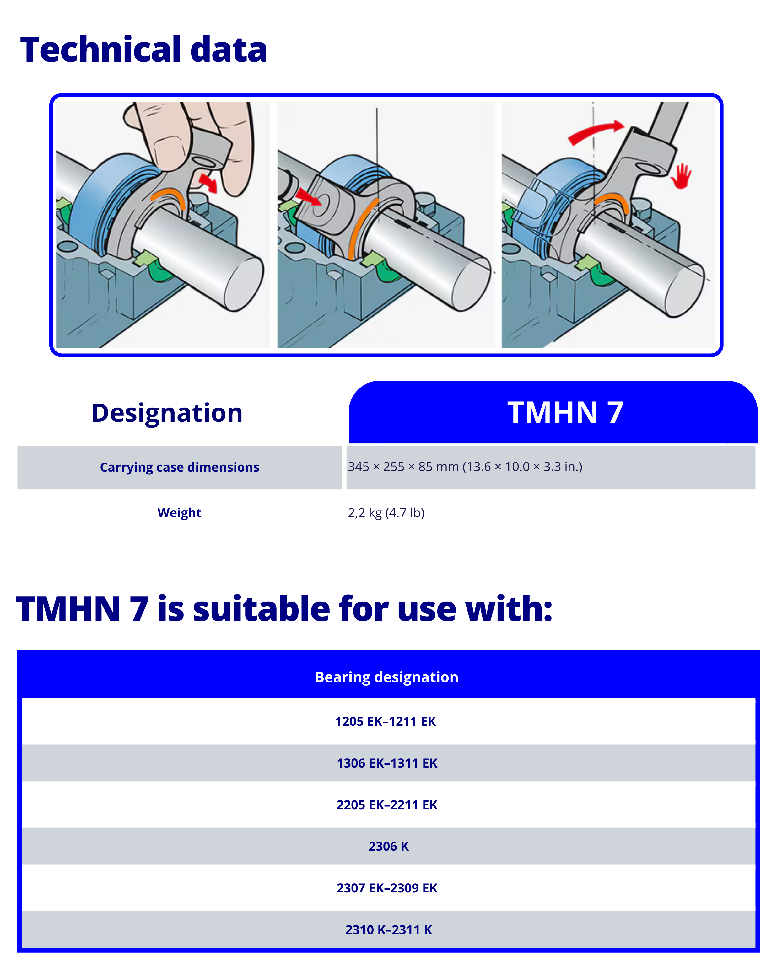 ชุดประแจขันน็อตล็อค SKF TMHN 7 ออกแบบมาเพื่อการติดตั้งตลับลูกปืนเม็ดกลมปรับแนวได้เอง (SABB), ตลับลูกปืนเม็ดโค้งสองแถว และตลับลูกปืน CARB บนเพลา หรือบนปลอก (ตัวเรือน) อย่างแม่นยำและปลอดภัย เหมาะสำหรับการใช้งานร่วมกับแป้นเกลียวชุด KM ทั้งบนเพลาและภายในตัวเรือน SNL ช่วยลดความเสี่ยงจากการขันน็อตล็อคแน่นเกินไปซึ่งอาจทำให้เกิดความผิดรูปของระยะรัศมีและความเสียหายต่อแบริ่ง