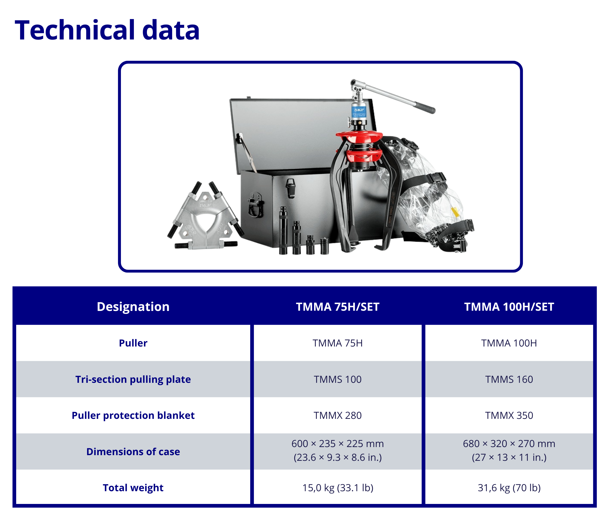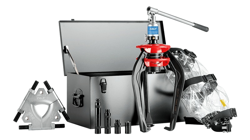 ชุดเหล็กดูดตลับลูกปืน 3 ขาแบบไฮดรอลิก SKF TMMA 75H/SET และ TMMA 100H/SET เป็นชุดเครื่องมือถอดตลับลูกปืนแบบครบชุดที่พร้อมใช้งานทันที เหมาะสำหรับงานถอดตลับลูกปืนขนาดกลาง–ใหญ่และชิ้นส่วนที่สวมแน่นในงานอุตสาหกรรม ชุดประกอบด้วยตัวถอดไฮดรอลิก EasyPull แบบ 3 ขาที่กางพร้อมกันได้โดยไม่ต้องประกอบทีละขา ฝาประกบสามแฉก ถุงครอบนิรภัย และกล่องบรรจุที่แข็งแรง ทำให้งานถอดปลอดภัย รวดเร็ว และไม่ทำให้เพลาเสียหาย