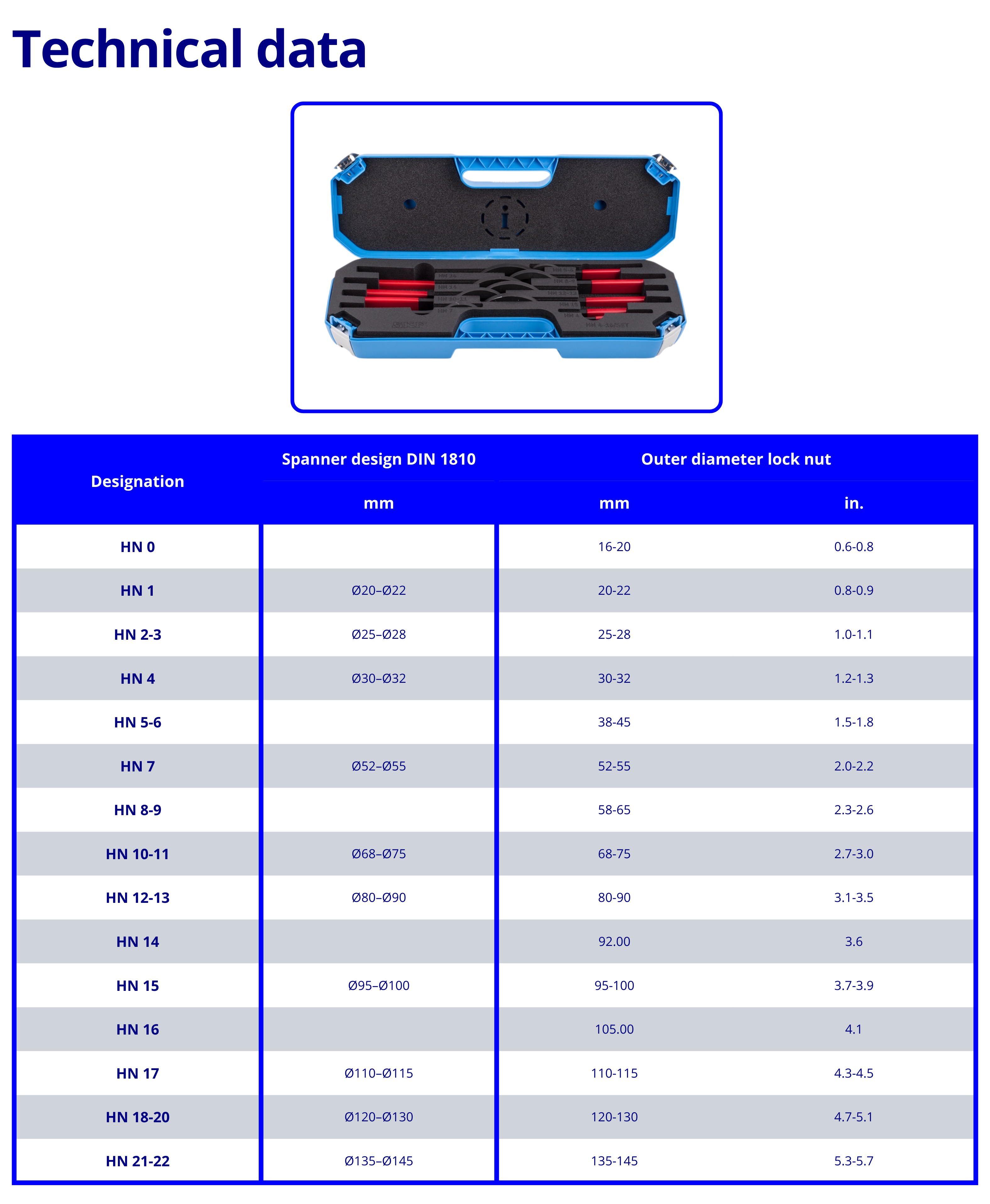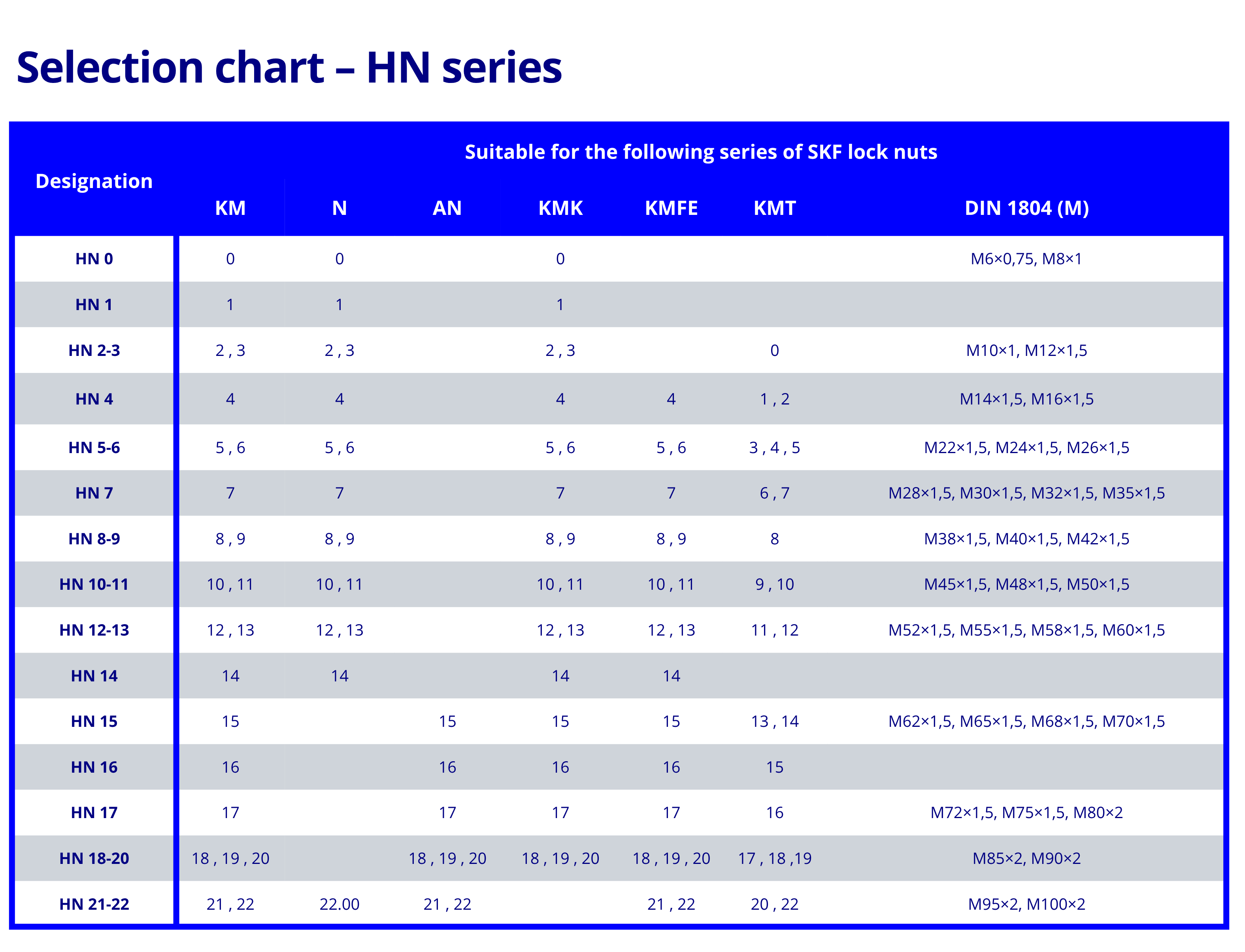 ประแจขันแป้นเกลียวรุ่น SKF HN Series ได้รับการออกแบบตามมาตรฐาน DIN 1810 สำหรับใช้งานกับแป้นเกลียวแบบ KM ของ SKF รวมถึงแป้นเกลียวตามมาตรฐาน DIN 981 และแป้นเกลียวรุ่นอื่นๆ เช่น N, AN, KMK, KMFE, KMT และรุ่นที่ผลิตตามมาตรฐาน DIN 1804 เหมาะสำหรับการติดตั้งและถอดตลับลูกปืนอย่างปลอดภัยโดยไม่ทำให้เพลาหรือแป้นเกลียวเสียหาย