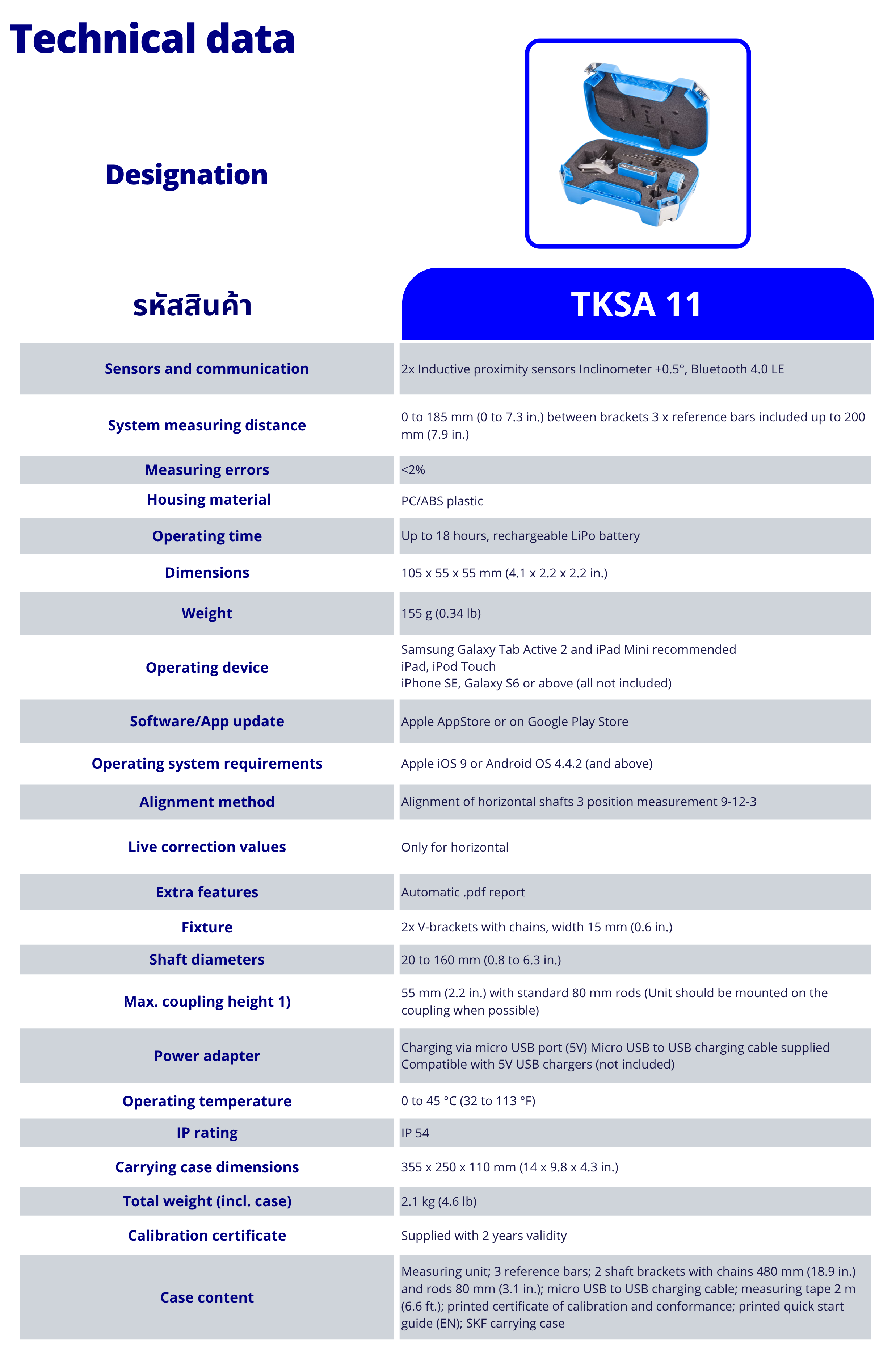 SKF TKSA 11 เป็นโซลูชั่นการตั้งศูนย์เพลารุ่นใหม่ที่ใช้งานง่าย เหมาะสำหรับผู้เริ่มต้น โดยใช้งานคู่กับอุปกรณ์พกพาของ Apple ผ่านแอปพลิเคชัน TKSA ที่ออกแบบมาอย่างเรียบง่ายและเป็นมิตรกับผู้ใช้ ใช้เทคโนโลยี Proximity Sensor แบบเหนี่ยวนำเพื่อให้การวัดค่ามีความแม่นยำสูง ไม่ถูกรบกวนจากสภาพแวดล้อม เช่น แสงแดดจ้า อีกทั้งยังสามารถสร้างรายงานอัตโนมัติและแชร์ผ่านอีเมลหรือระบบ Cloud ได้ทันที TKSA 11 จึงเป็นเครื่องมือที่เหมาะสมที่สุดสำหรับงานตั้งศูนย์เพลาที่ต้องการทั้ง ความแม่นยำ ราคาย่อมเยา และความสะดวกในการใช้งาน