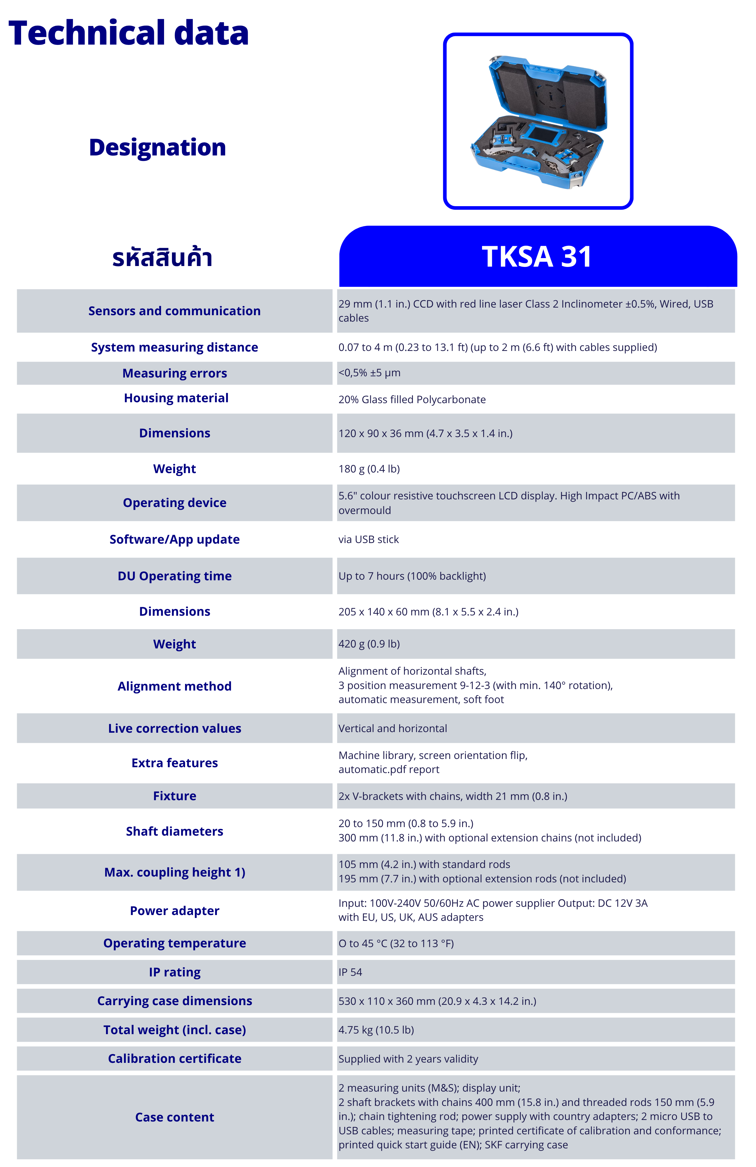 เครื่องตั้งศูญย์เพลาด้วยเลเซอร์ TKSA 31 SKF เป็นโซลูชั่นที่เหมาะสมที่สุดของ SKF สำหรับการจัดตำแหน่งเพลาด้วยเลเซอร์ที่ง่ายพร้อมหน้าจอสัมผัสทำให้เครื่องมือใช้งานง่ายและเครื่องในตัวช่วยจัดเก็บรายงานการจัดตำแหน่งสำหรับเครื่องหลายเครื่อง เครื่องตรวจจับเลเซอร์ขนาดใหญ่ในหัววัดช่วยลดความจำเป็นในการจัดตำแหน่งล่วงหน้า สำหรับการจัดตำแหน่งที่ประสบความสำเร็จ ฟังก์ชั่น เพิ่มเติมได้แก่ live viewและการวัดอัตโนมัติรองรับงานตั้งศูนย์ที่รวดเร็วและมีประสิทธิภาพและทำให้ TKSA 31 เป็นเครื่องมือตั้งศูนย์เพลาด้วยเลเซอร์ที่เป็นนวัตกรรมใหม่ซึ่งมีราคาจับต้องได้