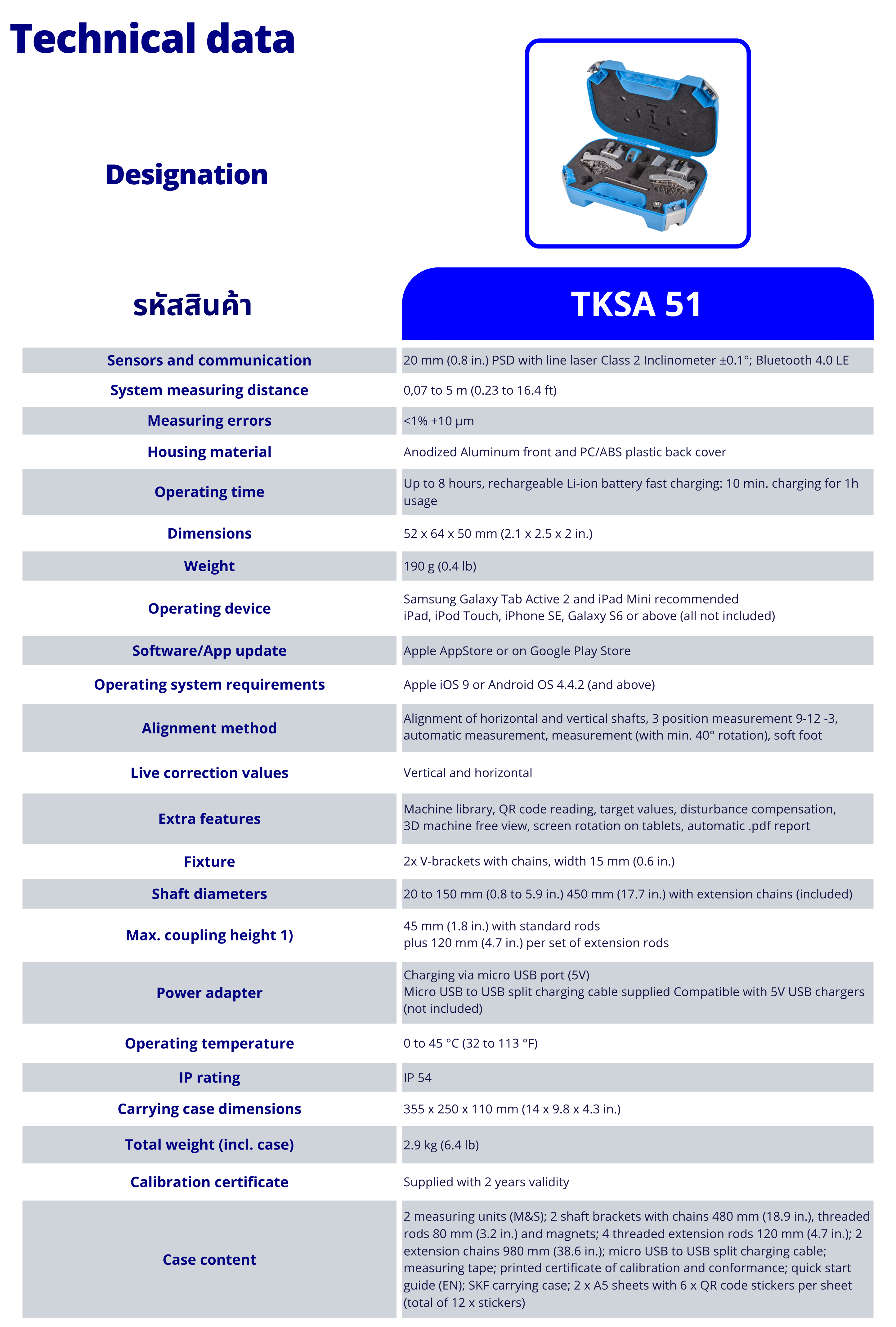 อุปกรณ์ตั้งศูนย์เพลา รุ่น TKSA 51 (Shaft Alignment Tool) ช่วยให้งานตั้งศูนย์เพลาเครื่องจักรเป็นเรื่องง่าย ได้รับการออกแบบมาให้ใช้งานกับแอพลิเคชั่น TKSA51 เพื่อการใช้งานบนแท็บเล็ต (iPad) หรือสมาร์ทโฟน (iPhone 4S ขึ้นไป) อุปกรณ์เสริมที่ให้มาในชุด ทำให้สามารถใช้ TKSA51 ในงานตั้งศูนย์เพลาได้หลากหลาย อย่างเช่น มอเตอร์ ชุดขับ พัดลม ปั๊ม เกียร์บ็อกซ์ และอื่นๆ อีกมากมาย ผู้ใช้งานสามารถดาว์นโหลดโปรแกรมผ่านทาง App Store