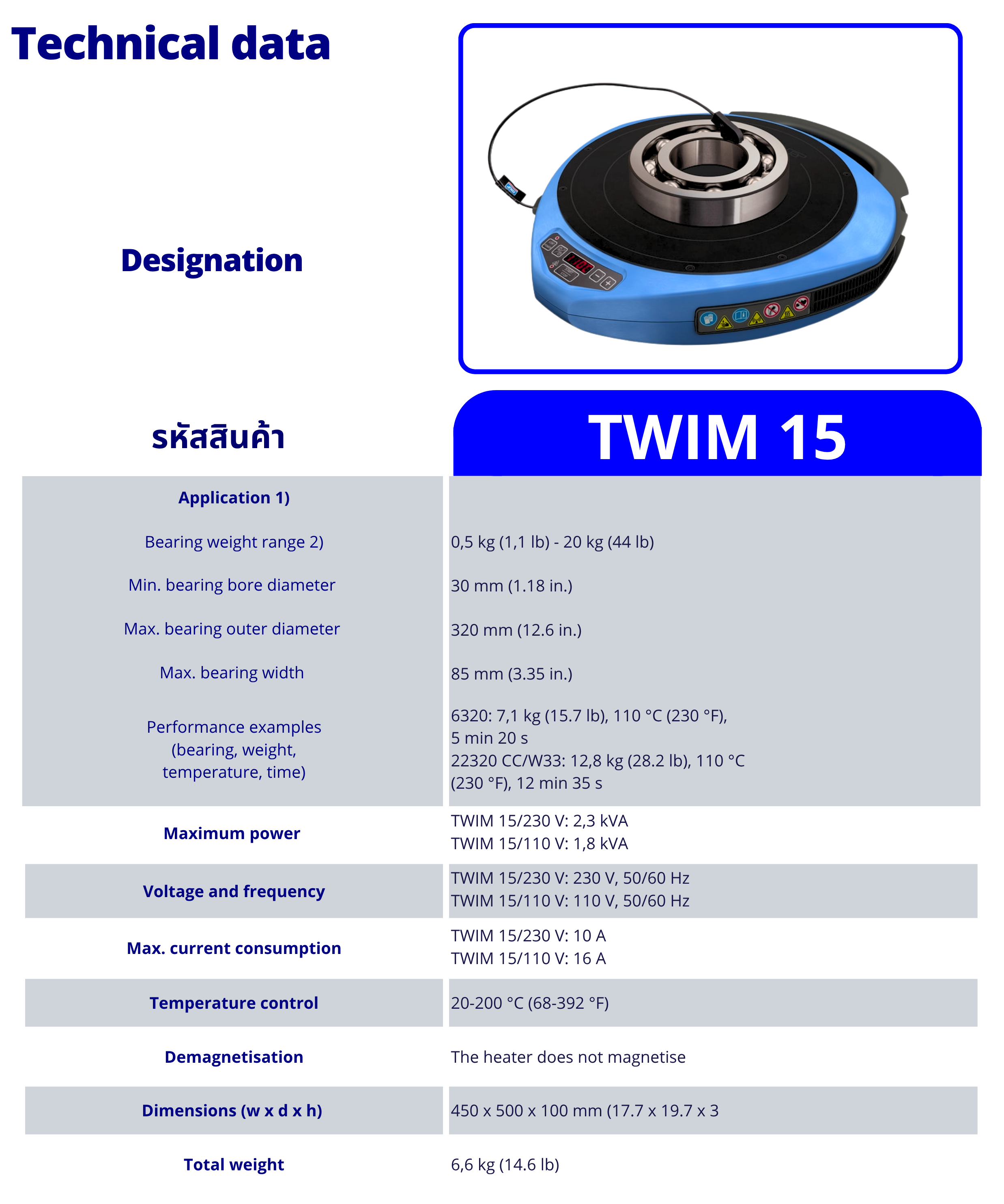 เครื่องทำความร้อนแบบพกพา SKF TWIM 15 ออกแบบสำหรับงานบำรุงรักษา เพื่อให้ความร้อนแก่ตลับลูกปืนและชิ้นส่วนโลหะวงแหวนก่อนการติดตั้ง ทำให้ชิ้นงานขยายตัวพอที่จะสวมเข้าที่ได้โดยไม่ต้องออกแรงมาก TWIM 15 ให้ความแตกต่างของอุณหภูมิที่เพียงพอ (โดยทั่วไป ≈ 90 °C) ระหว่างตลับลูกปืนและเพลา เพื่อช่วยให้การติดตั้งเป็นไปอย่างรวดเร็วและปลอดภัย ตัวเครื่องกะทัดรัด พกพาง่าย ใช้พลังงานไฟฟ้า มีโครงสร้างไฟเบอร์กลาสทนความร้อน แผงควบคุม LED ใช้งานง่าย พร้อมระบบตรวจสอบอุณหภูมิอัตโนมัติและปรับระดับพลังงานได้หลายระดับ