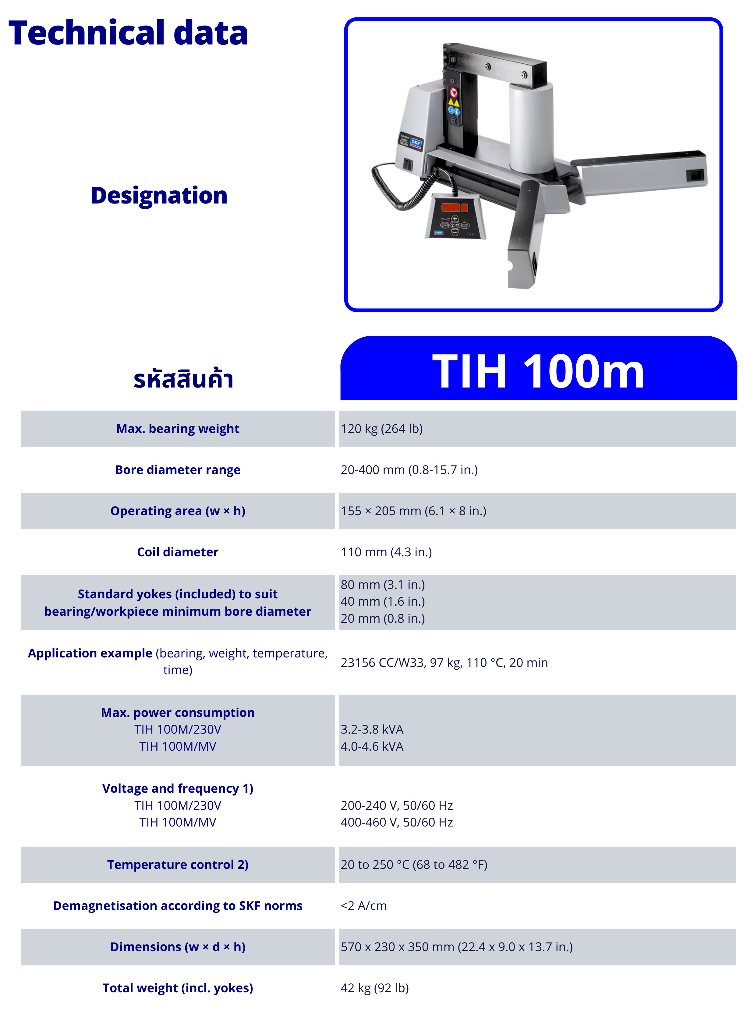 เครื่องทำความร้อนตลับลูกปืนขนาดกลาง TIH 100m ให้สมรรถนะสูงในขนาดกะทัดรัด เหมาะสำหรับการเตรียมตลับลูกปืนก่อนการติดตั้งในงานเวิร์กช็อปและหน้างาน ตัวเครื่องควบคุมพลังงานอย่างแม่นยำ ป้องกันการโอเวอร์ฮีท และออกแบบให้ขดลวด/แอกวางไว้ภายนอกตัวเครื่องทำให้สามารถให้ความร้อนกับตลับลูกปืนขนาดใหญ่ได้อย่างปลอดภัย