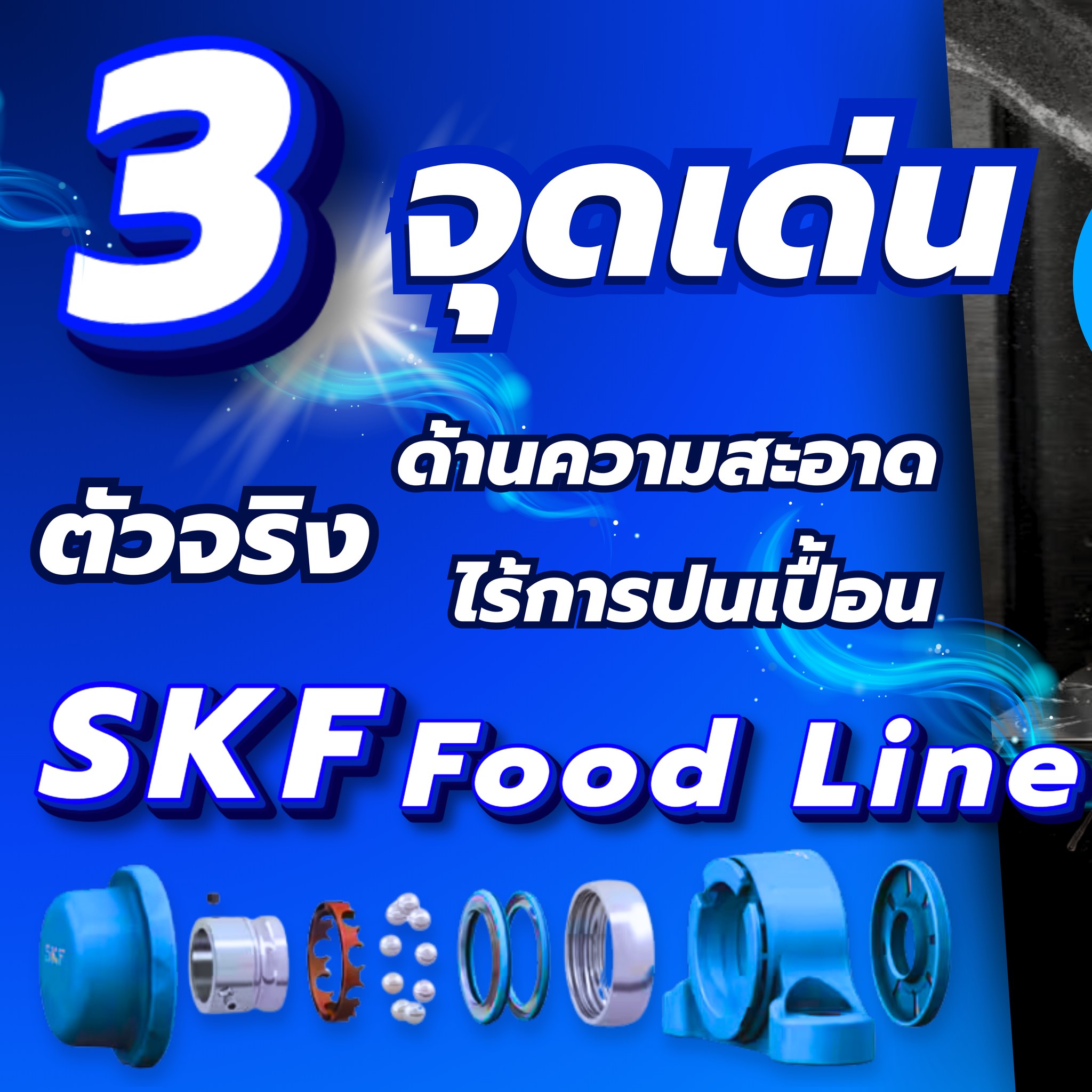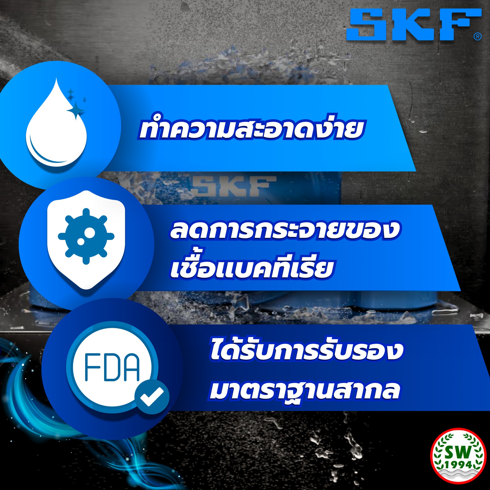 SKF Blue Range Food Line เป็นตลับลูกปืนสำหรับอุตสาหกรรมอาหารและยา ออกแบบมาเพื่อรักษาความสะอาดและความปลอดภัยของผลิตภัณฑ์ พร้อมคงประสิทธิภาพการผลิตต่อเนื่อง ลดความเสี่ยงจากการปนเปื้อนของเชื้อโรคหรือสารหล่อลื่น ด้วยวัสดุและดีไซน์ใหม่ที่ได้รับมาตรฐานสากล เช่น FDA, Halal, GMP, ISO, HACC ทำให้มั่นใจได้ว่าผลิตภัณฑ์ทุกชิ้นส่วนสะอาด ปลอดภัย และทนต่อการล้างทำความสะอาดด้วยน้ำแรงดันสูงและอุณหภูมิสูง